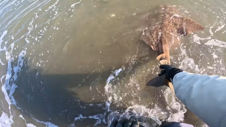 波打ち際で暴れる巨大な魚体。誰もが息をのむ。