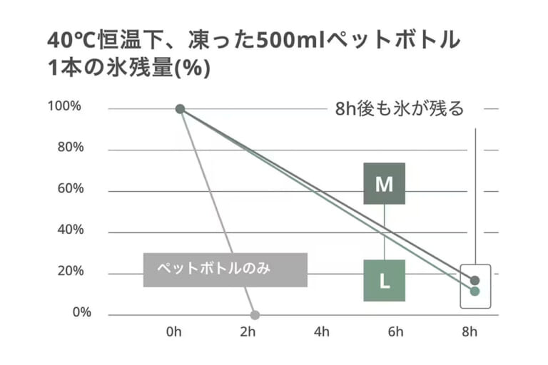底面には真空断熱パネルを搭載。冷気が逃げやすい箇所を重点的に遮断する構造により、40℃の恒温環境下でも500mlペットボトルの氷が約8時間持続する保冷性能を実現している。