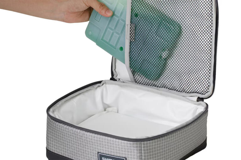 内装は拭き取りやすいTPU素材で、フタ裏には保冷剤を収納できるメッシュポケットを装備。