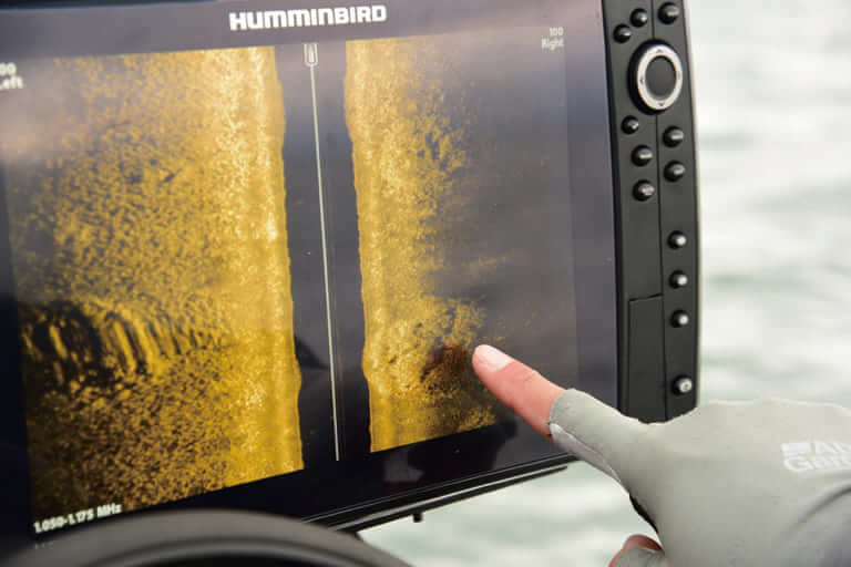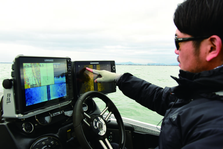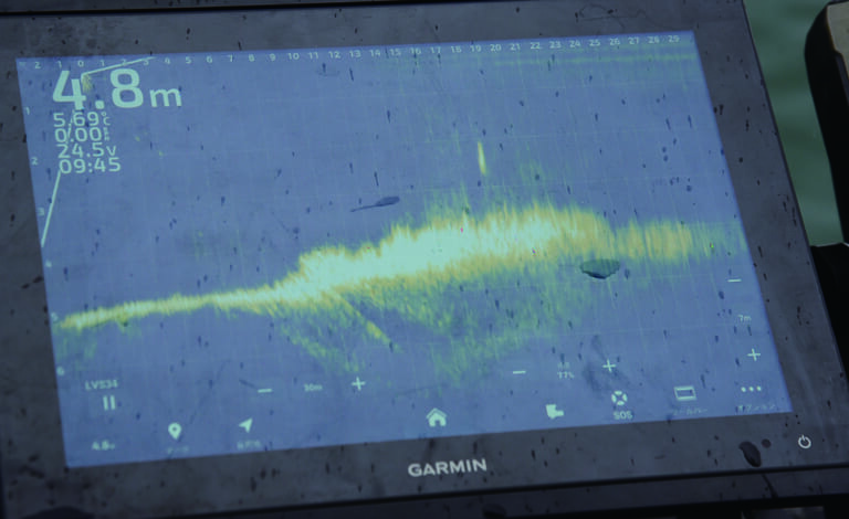 この時期のウィードのアウトサイドラインの水深は4~5メートル。そのあたりをサイドイメージで広く探っていく。ウィードパッチを見つけたら、ウェイポイントを打ち、入り直す。ライブソナーがあるならより正確なアプローチが可能となる。