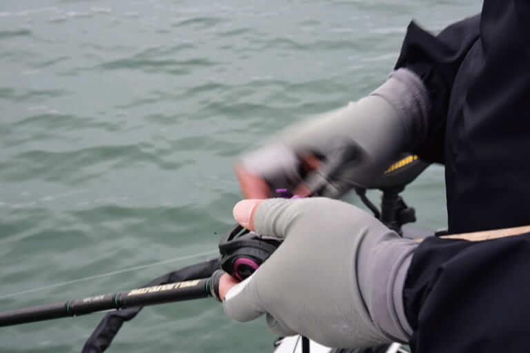 「ロッドをしっかり固定せずに巻いてしまうと先端がプラプラ動いてしまって、ルアーの動きが安定しない。なので、脇でグリップをしっかり挟んで、速巻きでもロッドがブレない状態を意識します。また、ウィードタッチが前提になるので、巻いていてほんの少しでも違和感があればすぐにリーリングを止めて、ほぐす作業に入ります。『ん?』と考えている間に半回転以上巻いてしまうともう完全に突っ込んでしまいます」。