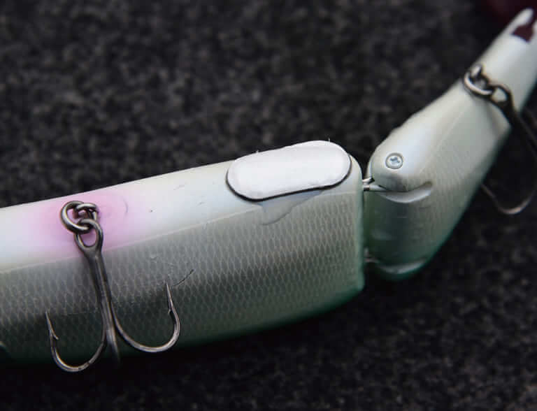 「鉛シールをリップの後ろに貼る人が多いですが、僕はお腹の後ろの方に貼っています。これは、自分の経験上、ルアーが水平姿勢を保ちながら入っていく方がいいと思っているから。これは好みかもしれません。でも、急潜行ではないですがじわじわと4m近くまで行きますよ」。