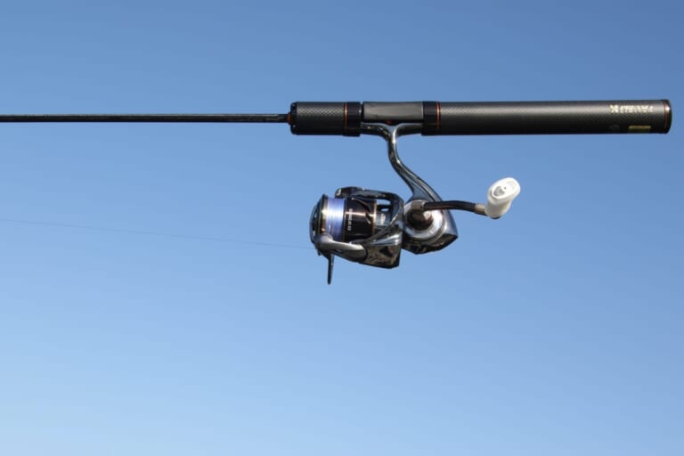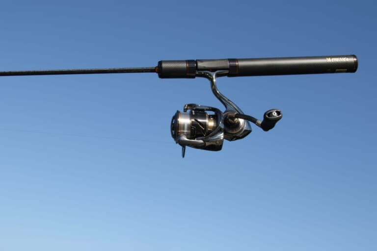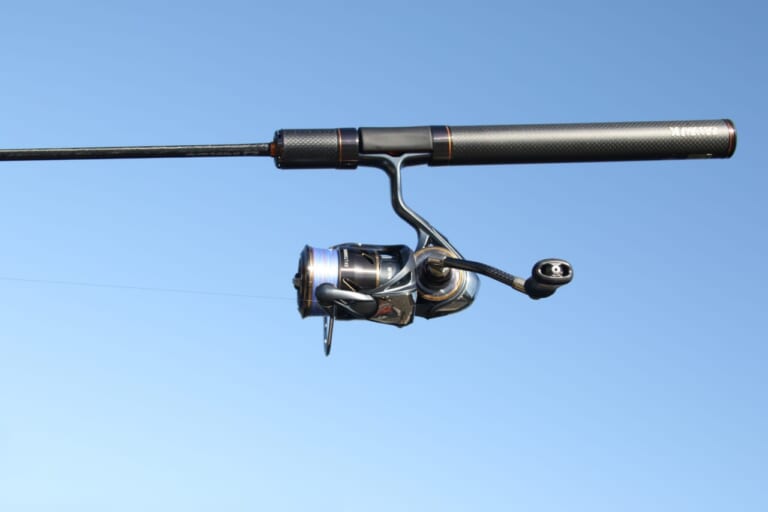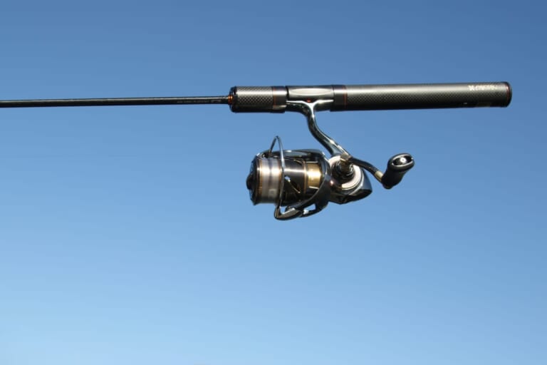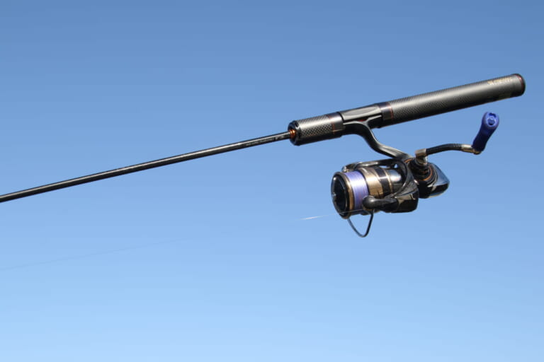 ミノーを大胆に動かせるロッドとの組み合わせ。軽さと強さを兼備するボディに50ミリのロングハンドルをセットして大物のパワーに対抗する。