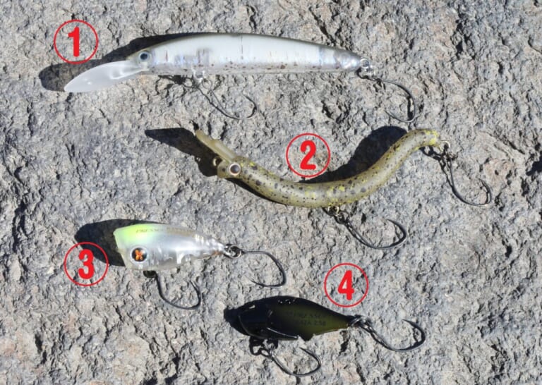 ①ニジマスとイワナ・イトウ狙いの二刀流ミノー。ジャーク、デジ巻き、ただ巻きなど。②和田さんの得意ワザ、ラインスラックを生かしたクレイジーシェイクで使用。③ラトル入りトップウォーター。突発的なバイトにもハイギアで対応する。④リフト&フォールではラインスラックも取りやすく掛けやすい。