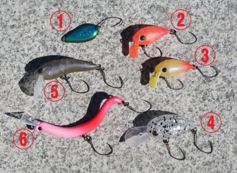 ①サーチ系スプーン。いい感じにラインスラックをキープして巻ける。②③ゆっくり浮くクランクと沈むクランクでレンジを合わせて巻いていく。④ディープレンジのサーチでこちらも巻くだけ。⑤11月頭の同エリアのイベントで爆釣したスリムな表層クランク。⑥巻く釣りをメインにするならノーマルギアがマッチする。