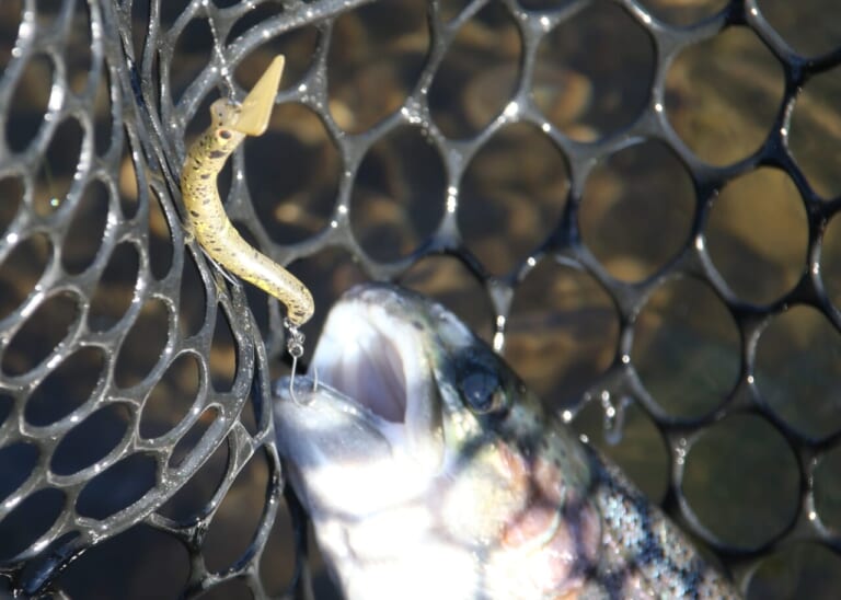 和田さん「ニョロクレイジーを使って、普通に巻いただけでもウネウネ泳ぐんですけど、細かいシェイクを入れながら巻くと連続で180度のテーブルターンをします。魚が見たことない動きなのか、普通のマスも大物も顕著に反応してきますね。実績は高いです」。