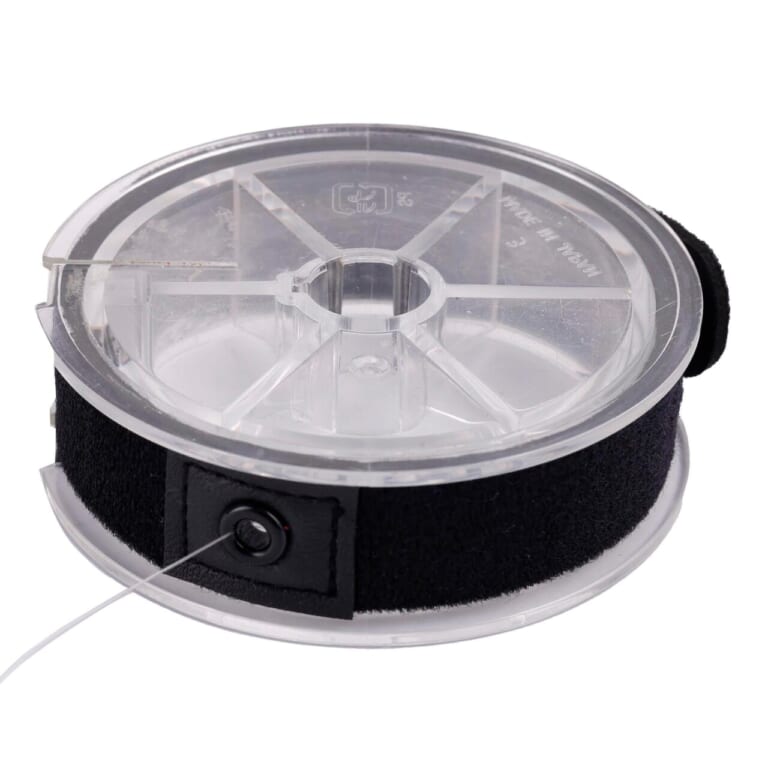 本製品は、市販のラインスプールに巻き付けて固定するベルト状のホルダー。最大の特徴は、本体中央に設けられたライン保持用のホール(穴)。ラインの端をこのホールに通しておくことで、スプール保管時&運搬時にラインが勝手に解けてバラけるのを完璧に抑え込んでくれる。ショックリーダーなどを必要な分だけ引き出す際もラインの端を見失うことがなく、常に次の作業がスムーズに行えるのが大きなメリットだ。