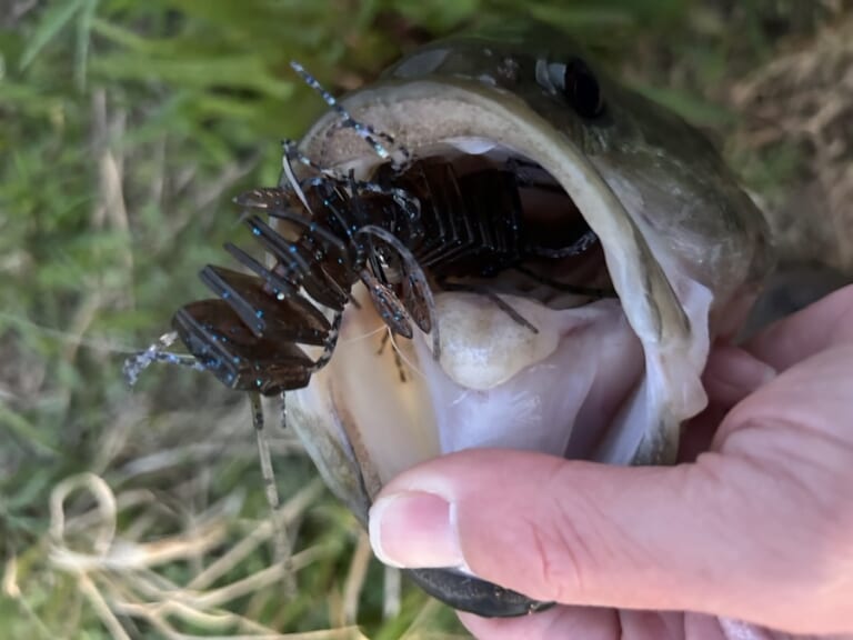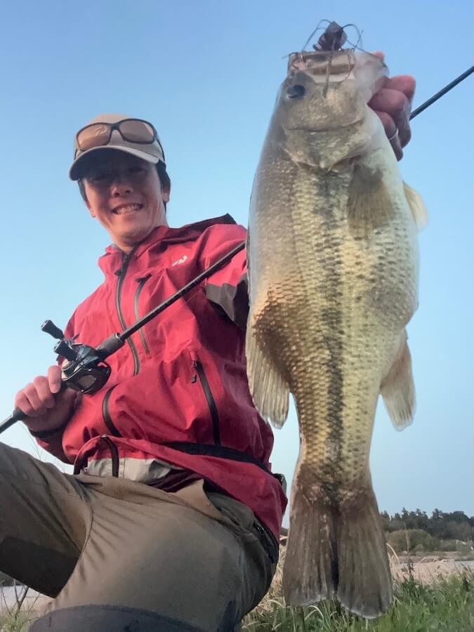 流入河川の深場からシャローに切り替わるところにあるアシへアプローチし、7gモリケンリグで中層でフワフワさせているとバイト!