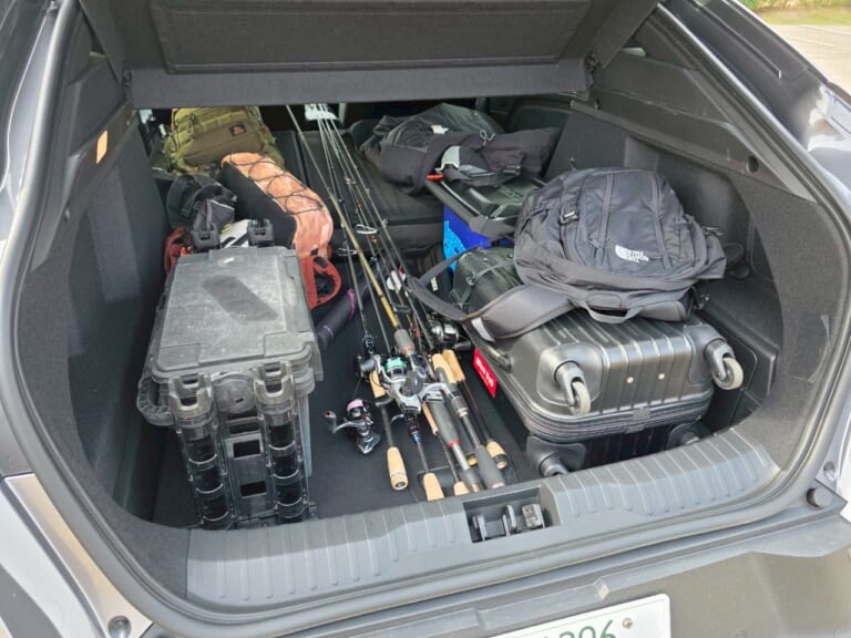 積載性もバッチリ。後部座席を倒せばワンピースロッドも問題なし。大人2名分の1泊2日分の荷物と釣具をぎっしりと積んだが、それでもまだ余裕がありそうだった。
