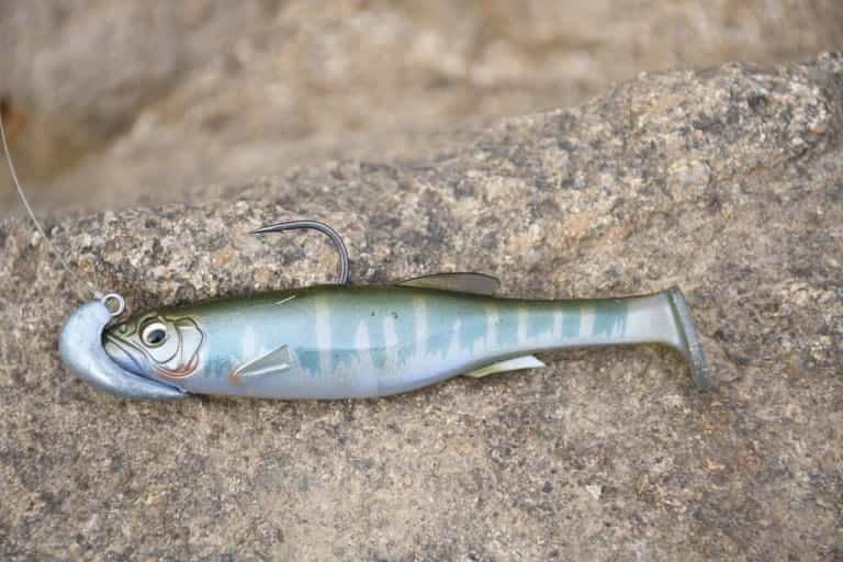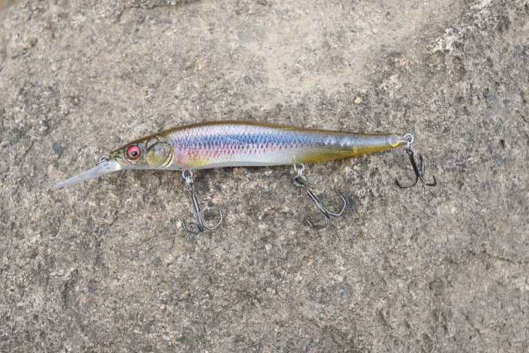 ホバストで釣っているところの一段深いところの岩をトレースするのに使用。「ヘッドまで綺麗にロールするのがマグドラフトのいいところ。ただ巻くだけじゃなくてストで使ってもOK。マグドラフトへッドは根掛かり回避性能がものわかる高くて、ロックエリアのボトムを舐めるように引いてこれますよ」。