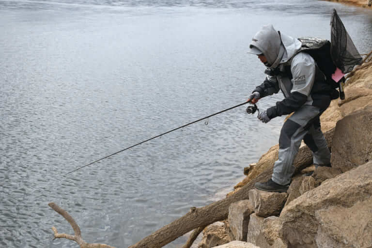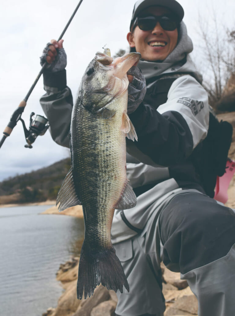 岩と岩の隙間にルアーをトレースし、追い込バイトを演出。グッドサイズばかりを釣り上げて、取材は早上がり。「全部トリプルA級の場所にいましたね。良くも悪くも一等地にしかいなくて、シャローの魚自体は多くない。簡単そうに見えるかもしれませんが、めちゃくちゃ考えてやってますから(笑)。やっぱり冬は難しいですよ」。