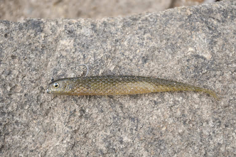 ロックエリアをボトムをこすりながらゆっくり引いて使用。「デッドスローに特化したシャッドテールワームなので、低水温期にぴったりです。フロロラインの重さを使って、ラインを弛ませながら引いてくるのがコツ」。フックはインフィニ#5/0(リューギ)で、ネイルシンカーTG0.9g(リューギ)をイン。