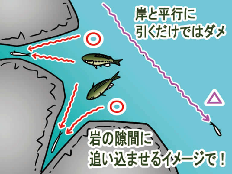 岩のガレ場を攻める場合、岸と平行にトレースするのは最善手ではない。岩と岩の隙間があるような場所を狙って、そこにルアーを引いてくる。こうすることで、バスがルアーを岸に追い込んだように見せることができ、バスの本気のバイトを引き出すことができる。