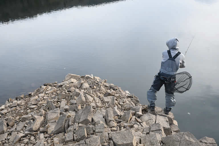 植盛さんが狙っているのはすべて足元。湖上に迫り出した岩と岩の隙間を狙って、そこにルアーを進ませていく。バイトが出るのはほぼ足元だ。