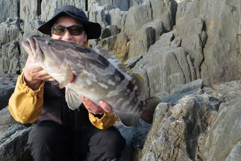 正体不明の何かがヒットした。磯際に寄せた魚を見て驚くヨネスケさん。