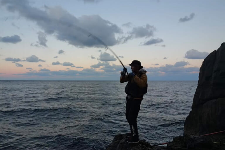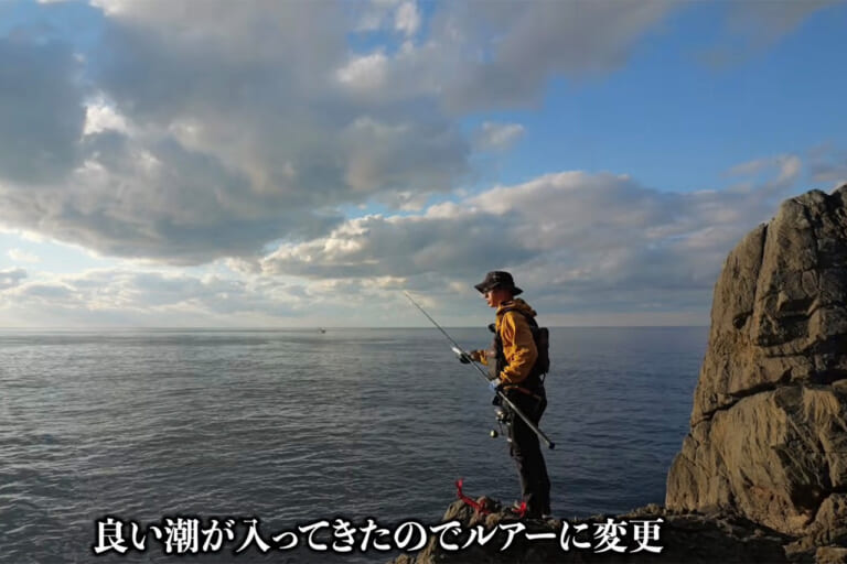 夕まづめ、潮の動きに変化が出た瞬間、ヨネスケさんはルアーロッドに持ち替えた。 「一気に雰囲気が変わった」と直感するヨネスケさん。ここは潮通しがよく、デカいヒラマサやキハダが回ってくることもあるという。