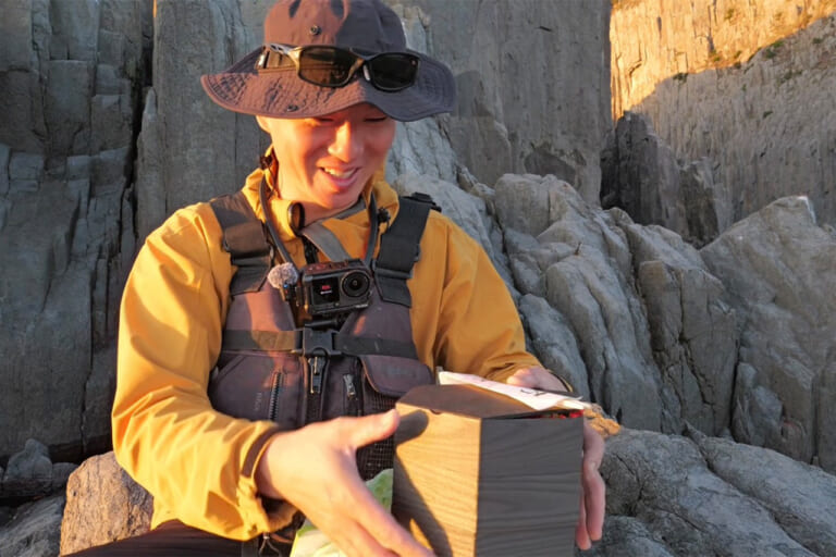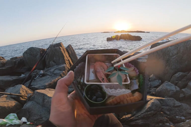 沈みゆく絶景の夕日を眺めながら、磯の上でおせちを頬張る。