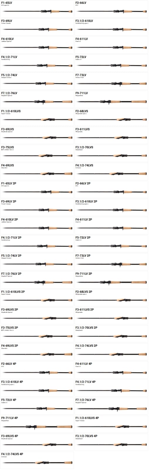 ベイトフィネス専用の「F1-65LV」から、メガバス史上屈指のパワーを誇るジャイアントベイト用「メガラザン(F9-711LV)」まで、あらゆるメソッドに対応する。