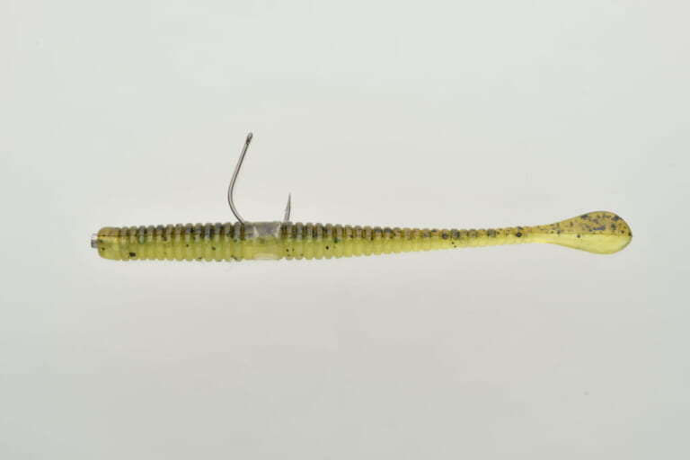 ストレートワームの超定番。カーリーテールの根元をのみを残したフォルムは、適度な水押しと共に