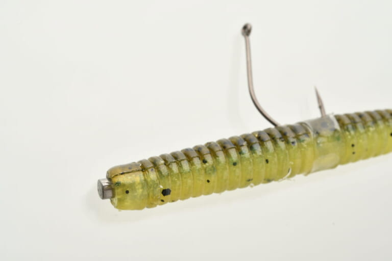 頭部にネイルシンカーを挿入することで、ワームの姿勢を縦方向に安定。ネイルシンカーを完全に埋め込んでキャスト時の抜けを防ぐか、若干飛び出させることで底の状態をより感知しやすくするかはお好みで選択を。事前にハリ先等で刺した下穴があれば挿入しやすい。なお、ネイルシンカーホールが標準設計されているモデルも近年では存在。