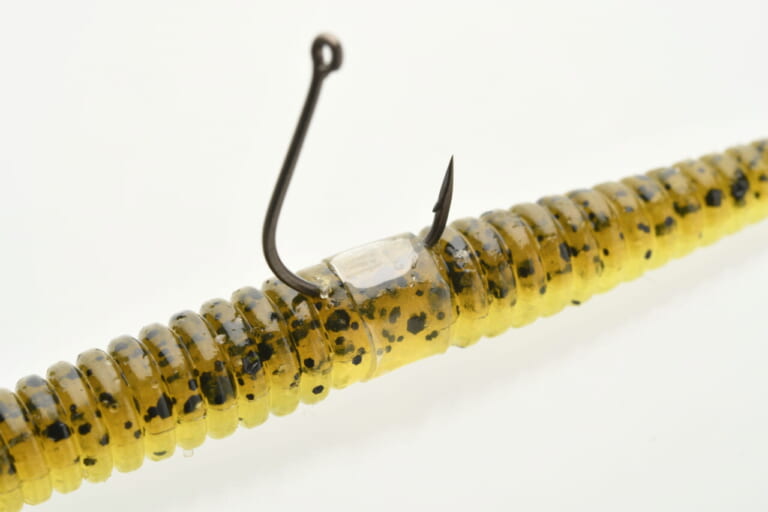 ワームの中ほどにフックを刺すため、使用中に裂けが生じてロストにつながりやすいのは必然。事前にワームに装着したリングにフックを掛けたり、チューブ越しにフックを刺すことで、ワームの劣化を防ぐ方法もある。