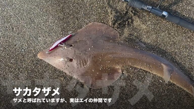 サカタザメとは、サメと名前が付いているがエイの仲間。ここ宮崎サーフでは暖かくなると釣れることも多いという。