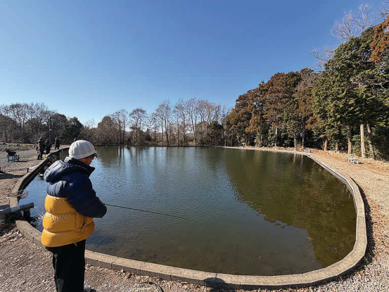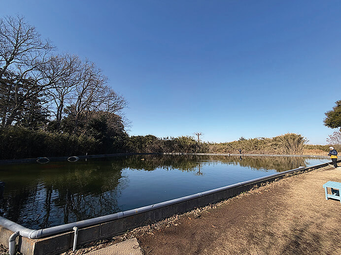 ため池タイプのポンドがこの日は不調?釣れている姿は見られなかった。「こっちも護岸池と同じくらい放流されているみたいです⋯なんとか釣りたい!」。