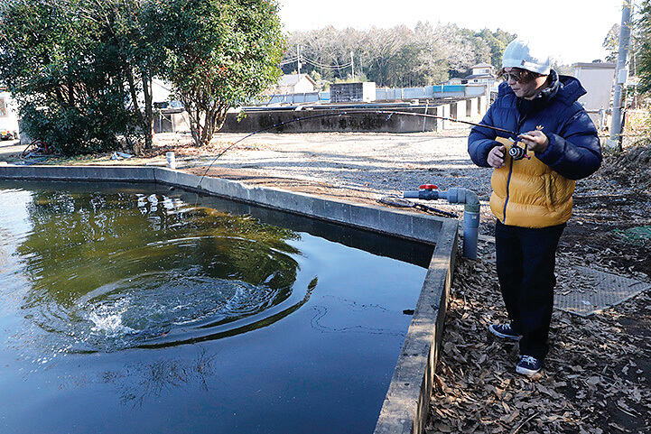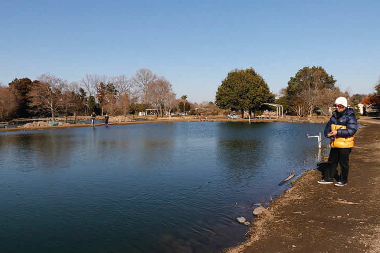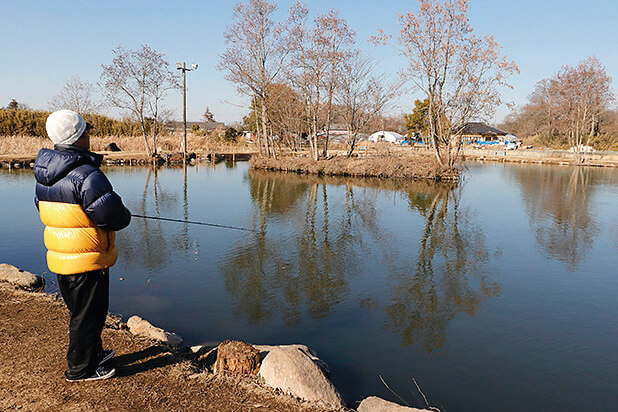 意外と飽き性なので⋯と本多さんは笑ってコメントしてくれたが、それも釣り人の性(さが)。関東近郊には水戸南以外にも、キングフィッシャーさんや釣りパラダイスさん、時期によるが宮城アングラーズビレッジさんなど、複数魚種を楽しめる釣り場さんはいくつかある。早速、バス池で釣りを始めるも風表となる側は凍っている始末。これは水温が上がる午後までは厳しい釣りになりそうだ⋯。