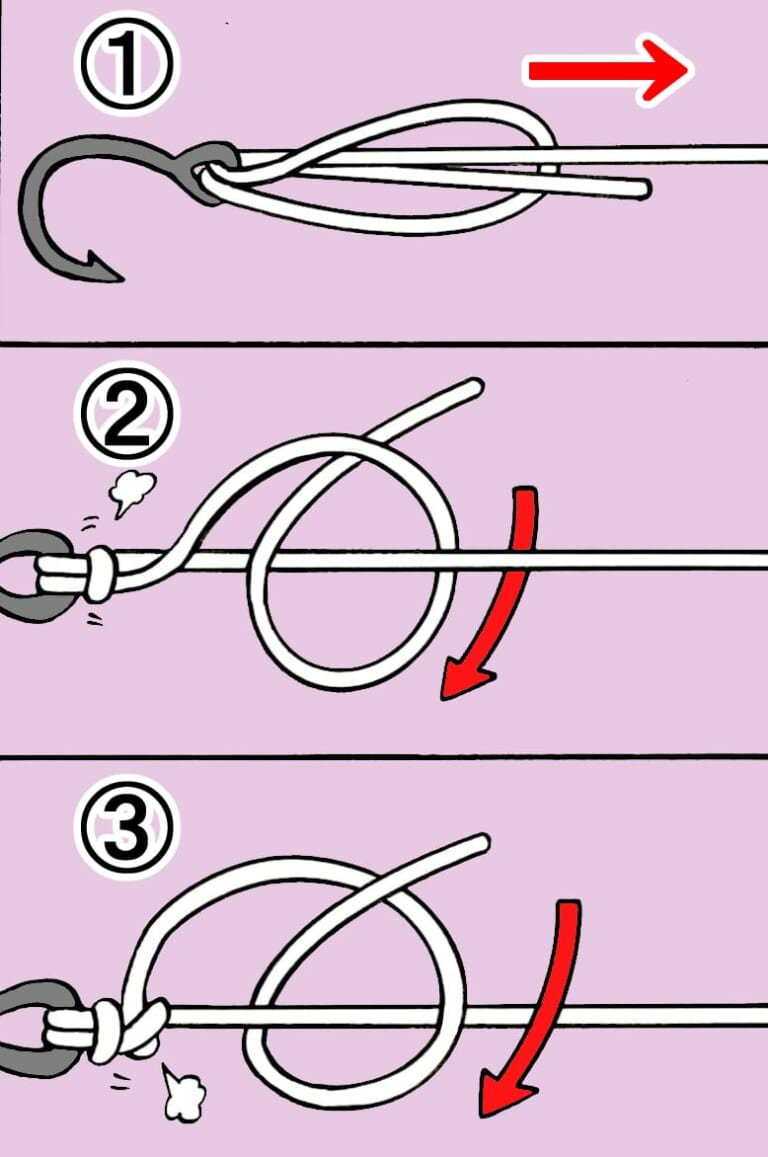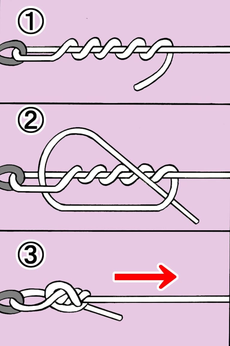 ①二つ折りにしたラインをアイに通し、その輪にルアー(フックやスナップ)を潜らせ、引き締める。