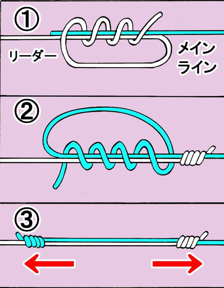 ③メインラインの先端部で本線とリーダーをまとめてかた結び。これを1回ずつ強く締めつつ、4~5回行う。