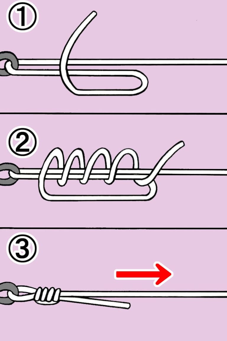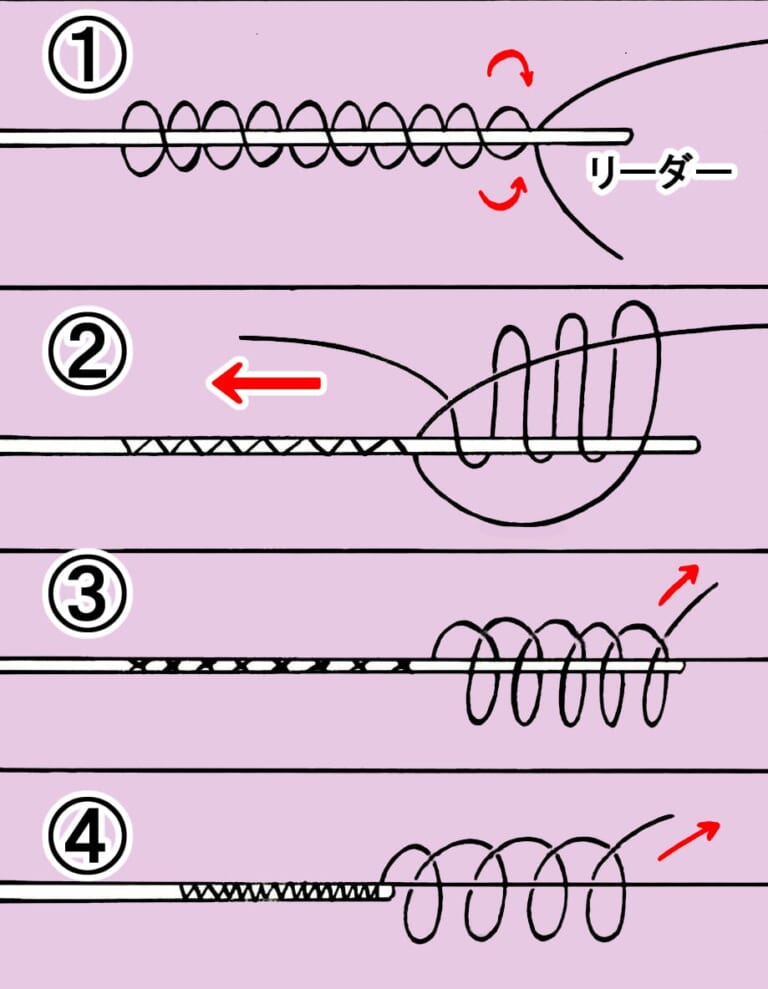 ②メインラインの先端で輪を作り、本線とリーダーを一緒に3回ほど巻き込み、強く締め込む。