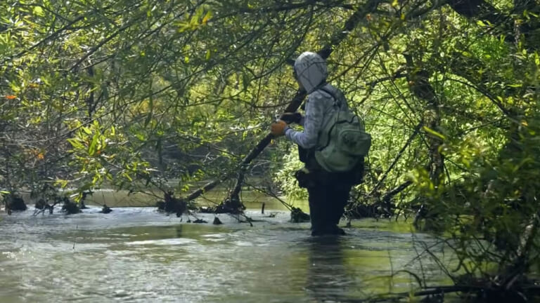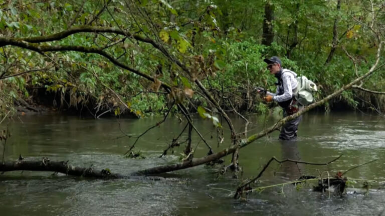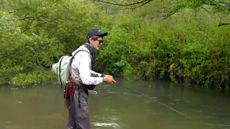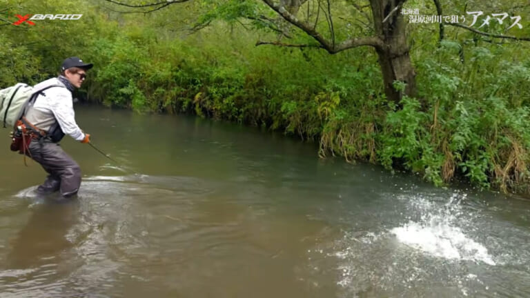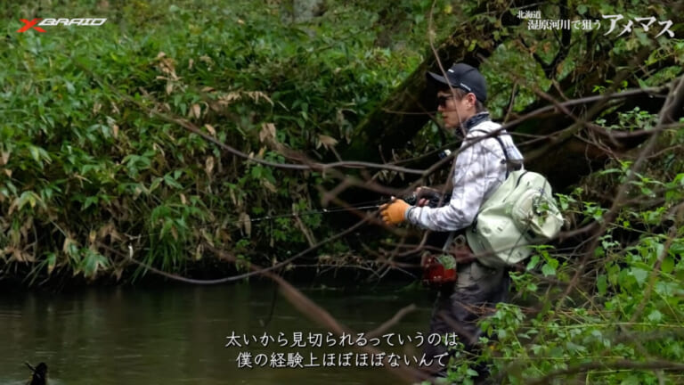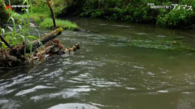 今回の動画の実釣フィールドは湿原を流れる河川。川幅はさほど広くはないが、川岸はヤブに覆われ水中に倒木が横たわり、そこに重くて強い流れが絡む。キャストもファイトも難易度が高そうだ。