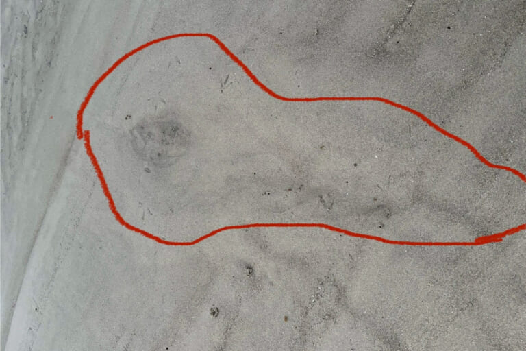 船長曰く、朝一のタイミングではマゴチは海岸近くのブレイクに身を隠していることが多いようで、疑心暗鬼のままルアーをキャストしていると船長から「Hey!! Look at this!!(これを見ろ)」と指さされたのは潮が引いた砂にマゴチが待ち構えていたと思われる1mほどの跡でした。