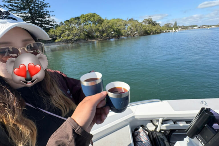 釣行時期は春の終わり頃ですがオーストラリアの日差しは沖縄並みに強い。なので海外で痛い目に遭いたくなければロングシャツに日焼け止めは必須です!ですが朝方は冷えるため、船長がコーヒーを淹れてくれました。船上で飲むコーヒーは格別ですね。
