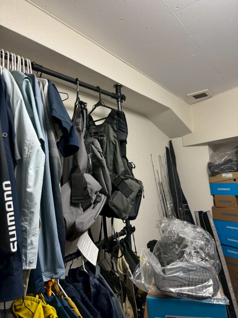 釣り部屋は遠征用の蚊帳なども置いてありますが、(笑)ほぼ釣り道具だけ!ウェア・シューズ・ライジャケ・ギンバル・ウェーダー・ロッド・リール・ルアー・ライン・フック・カバン・クーラーBOXとなるべくわかりやすく整頓。取り出しやすく、仕舞いやすくしました!