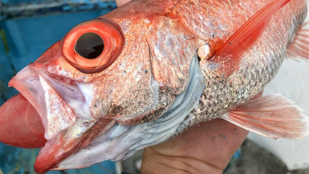 アカムツは、スズキ目ホタルジャコ科に属する魚。体色が鮮やかな赤色であることと、姿がムツに似ていることからその名が付いたが、分類上はムツの仲間ではない。口の中が黒いことから「ノドグロ」という別名で広く知られており、市場では超高級魚として扱われる。“白身のトロ”と称されるほど脂の乗りがとてもよく、釣り人にとっては垂涎の的となるターゲットだ。