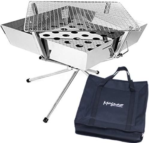 MAGNAのファイアグリルは、0.8mm厚の極厚ステンレス鋼を使用しており、高温でも歪みにくい構造が特徴だ。本体サイズは49×49×32.5cm、重量は約3.2kgとしっかりとした安定感があり、炭火調理や焚き火にも安心して使用できる。この厚みは有名ブランドの定番モデルと同等で、長期的な使用にも耐える強度を持つ。