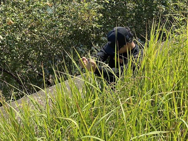 今度は抜き上げる途中でバラシ! 水際の草にバスが落ちる。これを掬ってもカウントはされないがネットを差して救助を試みる。ネットが届く前に、バスは自力で水中へ。