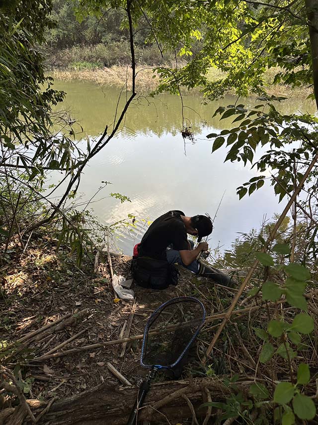 「この時間になると、バックウォーターであっても影を狙うのが有効となる。というわけで岸沿いのオーバーハングや岩の影にサイコロラバーを入れてみましょう…」と言った途端、澤村さんのロッドが満月に曲がった!