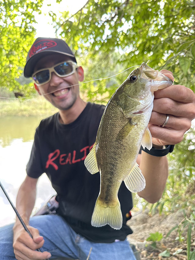 対岸の冠水ブッシュから45センチ級が出てきたところに、サイコロラバーのスジエビを投げ込むと水面がモワッと盛り上がり、次の瞬間に竿が絞り込まれた。しっかり食い込むのを待ってから合わせるも、しかし連続バラシ!