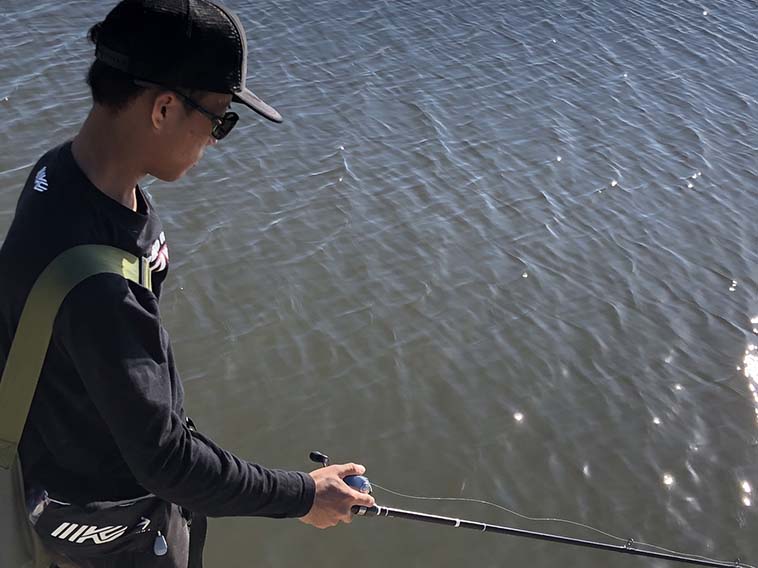 「でっかいバスはベイトを選んで食ってる気がする。バマストってバスとの距離が近くて弱々しいサイドの小さいワームに食ってくることが多いんですが、ここ(五三川)はプラクティスの時も含めて全部真ん中の大きいワームに食ってきますね。ボラ食いです。…また食った!」