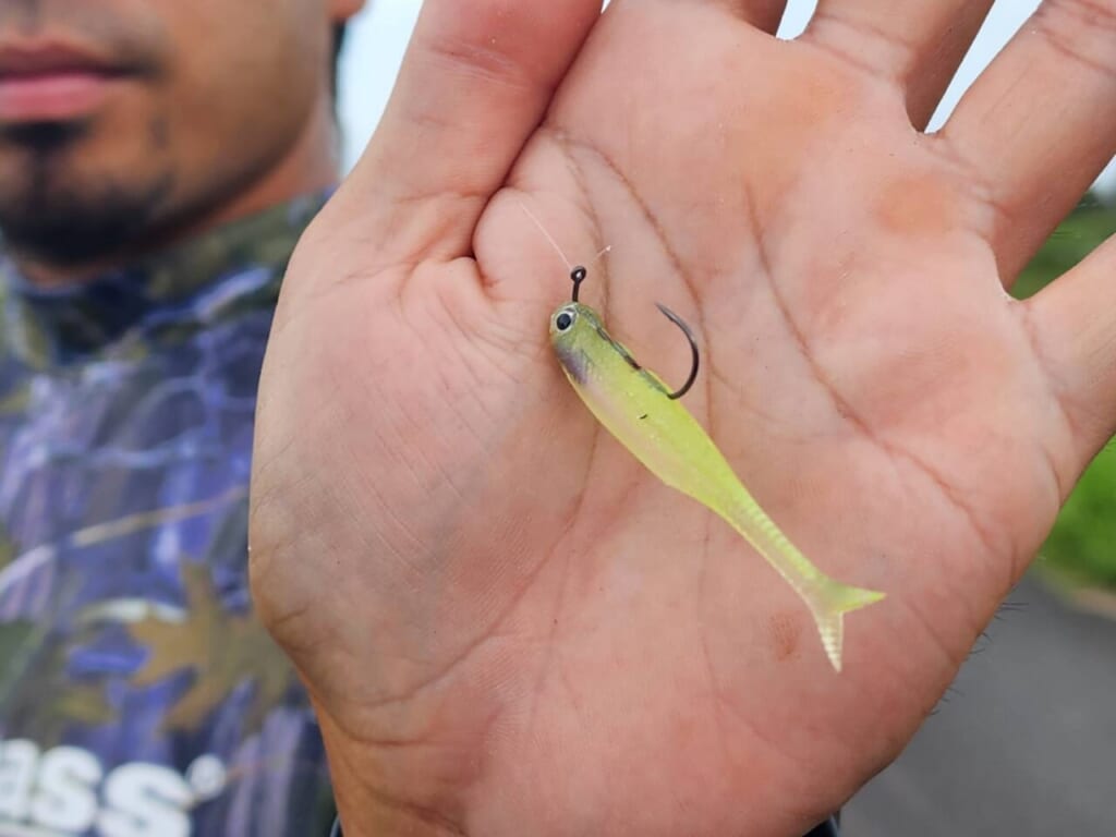 「0.2グラムシンカーをいれて表層を狙います。これより下ならベビーエクスプローズ、ボトムならイモのラバーチューンです」