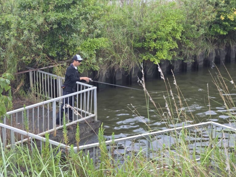和田岬北の水門まで移動してきた山添さん。まずはメタルブレードジグで広範囲を探ります。
