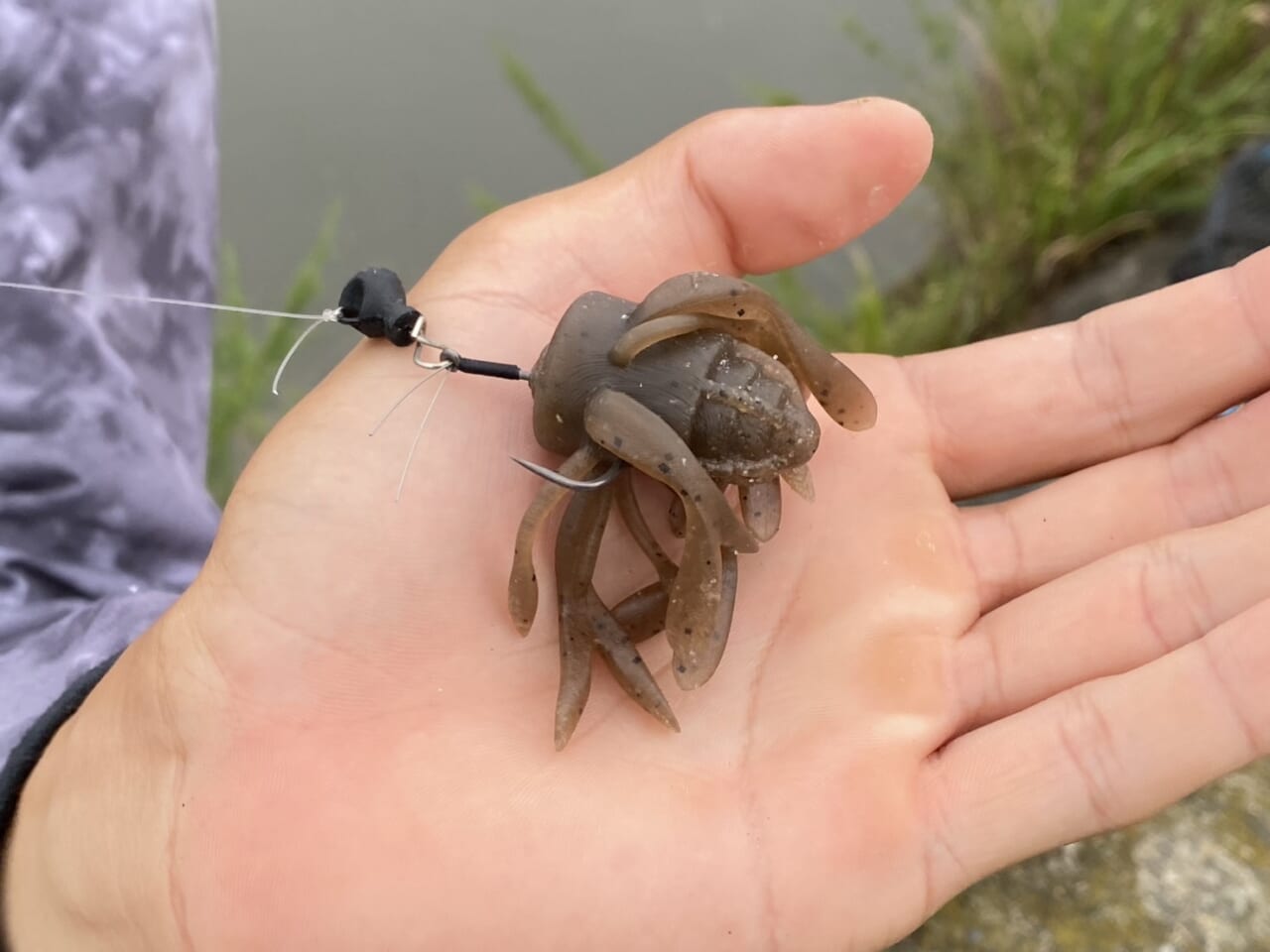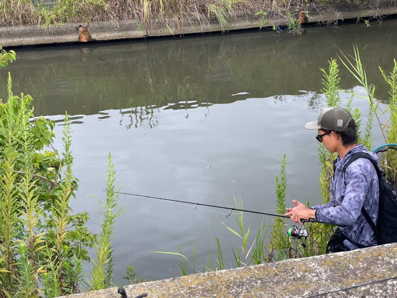 カバーが絡んだ護岸直下に付くバスを狙い、超至近から丁寧に誘い続ける