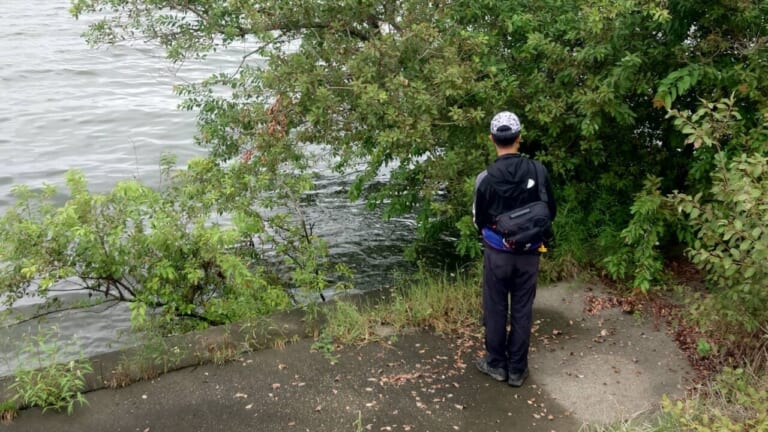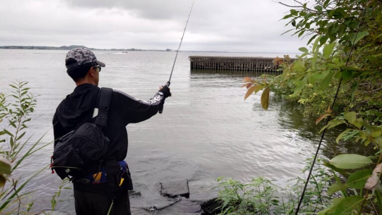 バスボートが行き交う中、ブッシュのランガンで集中力を高めて狙い撃つ。