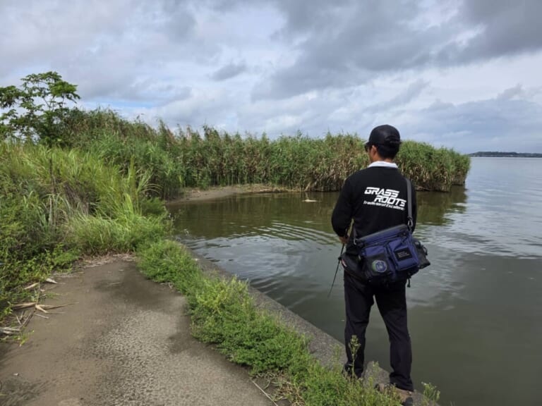 「浅すぎて丸見えでした。でかいバスです。さっきからエビが水面をピチャピチャやっていてバスもいそうだなとは思っていましたが…。あんないい魚、どこにいたんだ(笑)」